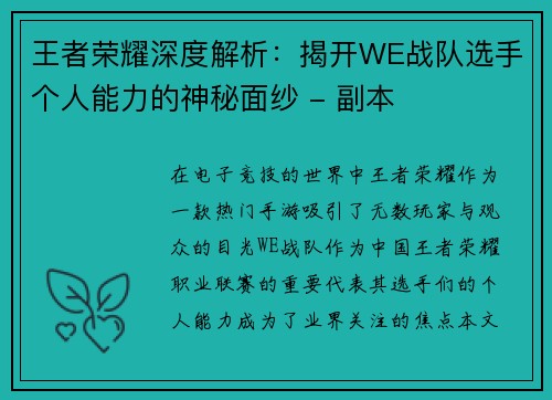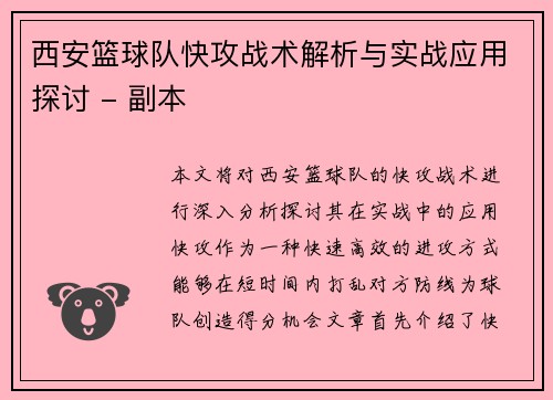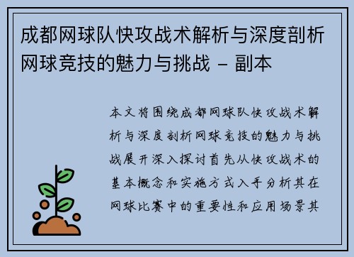 本文将深入分析上海网球队独特的盯防战术,以及这一战术所带来的优势和应用场景。首先,我们将探讨该战术的基本概念与特点,了解其如何在比赛中发挥重要作用。接着,文章将分析盯防战术在面对不同对手时的适应性,并讨论其如何提高球队整体防守效率。此外,我们还会重点讨论这一战术在比赛中的实际应用案例,以展示其有效性...